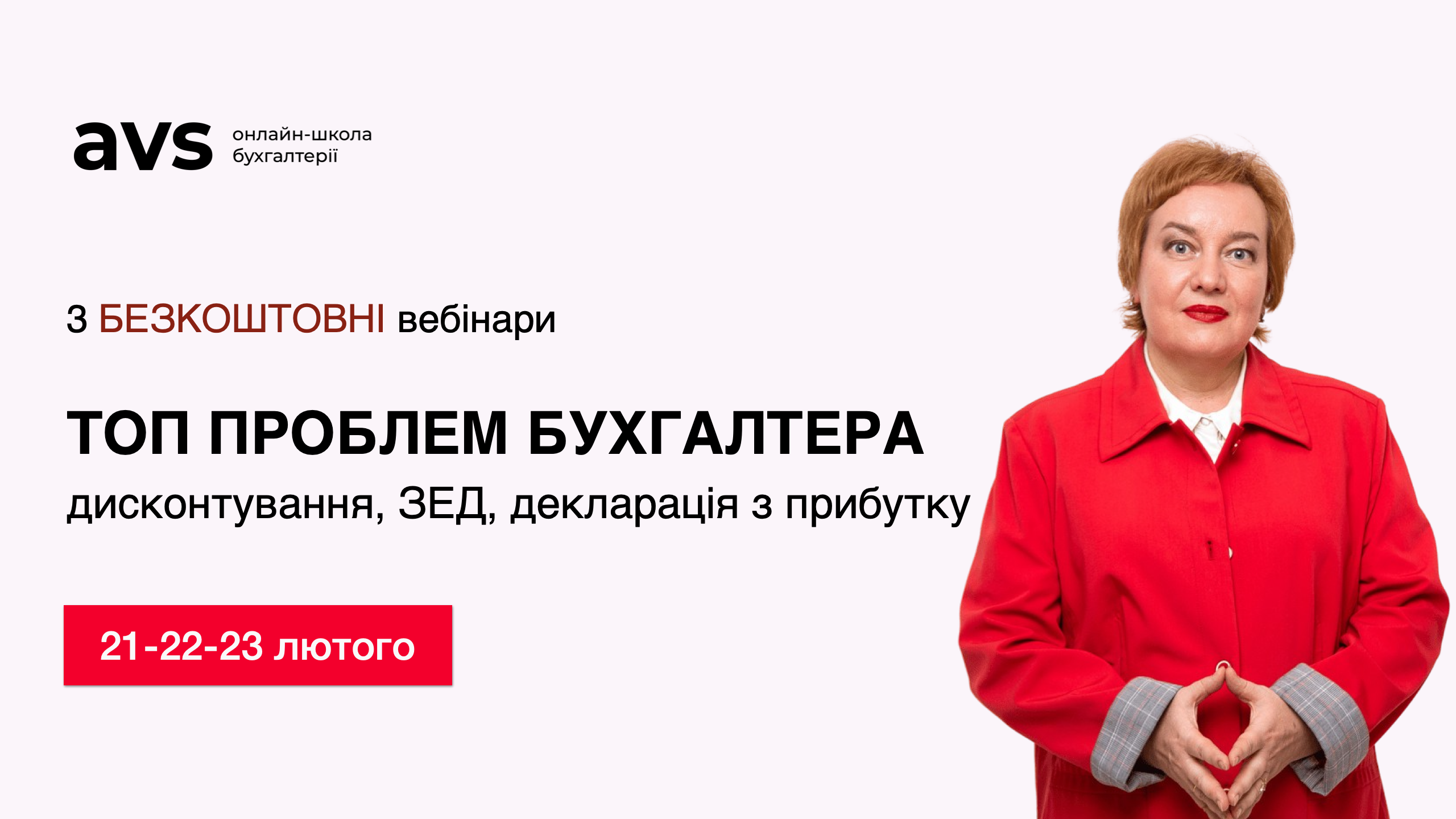 Запрошуємо Вас на серію безкоштовних вебінарів “ТОП проблем бухгалтера: дисконтування, ЗЕД, декларація з прибутку”, яку проведе Ірина Тимошенко (Експерт онлайн-школи бухгалтерії AVS). Реєструйтесь!